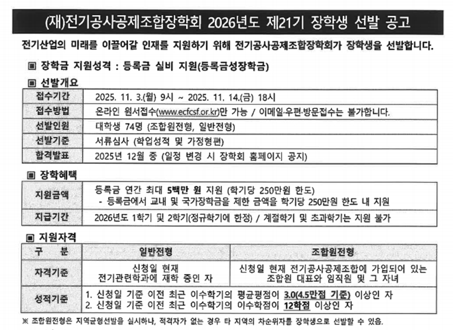 2026년도 전기공사공제조합장학회 장학생 선발 안내